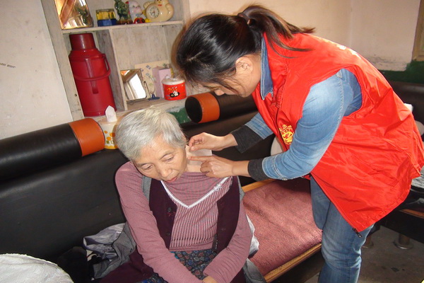 “陶奶奶,我问了医生,买来了这二种膏药,我帮您贴上。”10月27日中午,居住在安乡县深柳镇五总社区健康网格79岁的陶奶奶,刚吃完中饭,见到安乡县工会志愿者服务队四名志愿者来到家里,一名女志愿者为身患颈椎病、风湿病的陶奶奶仔细贴上了三张膏药。