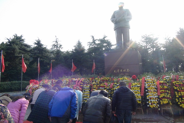 庄严、肃穆的毛泽东铜像广场,周围青松翠竹掩映,群山拱护。铜像全高10.1米。主席身躯伟岸,手执发言稿,身着中山装,双目炯炯,微露笑容,神采奕奕。全体工会党员和入党积极分子向毛主席铜像鞠躬缅怀,绕铜像一周瞻仰毛泽东同志铜像并敬献花篮。随后在铜像前重温入党誓词。