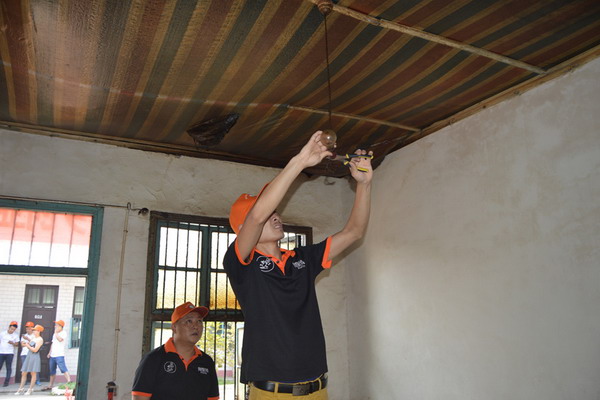 来自水电维修的个体商户志愿者仔细查看老人们房间里的水电设施,并对部分老化的水电设施免费更换。并手把手给老人们讲授如何安全用电。