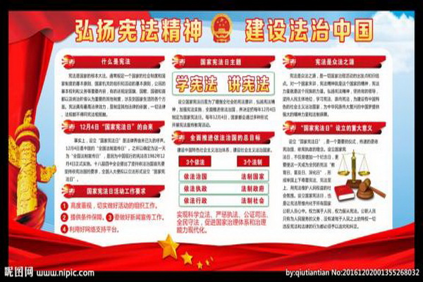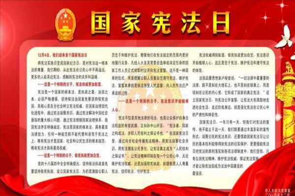 为深入贯彻落实党的十九大精神,增强全民法治观念,推动全社会树立宪法意识,日前,中央宣传部、司法部、全国普法办公室联合印发《关于开展2017年“12·4”国家宪法日集中宣传活动的通知》,将于2017年“12·4”国家宪法日前后,以“学习贯彻党的十九大精神维护宪法权威”为主题,集中组织开展系列宣传活动。
